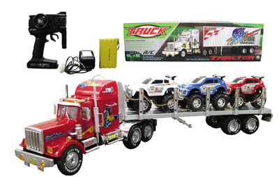 This RC Truck with Trailer is one big monster! This life-like truck delivers a load of three cars. Is a full function RC that is easy to drive. This RC is powered by high performance motor. It comes with everything you need, including rechargeable battery, charger and transmitter |