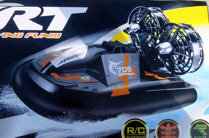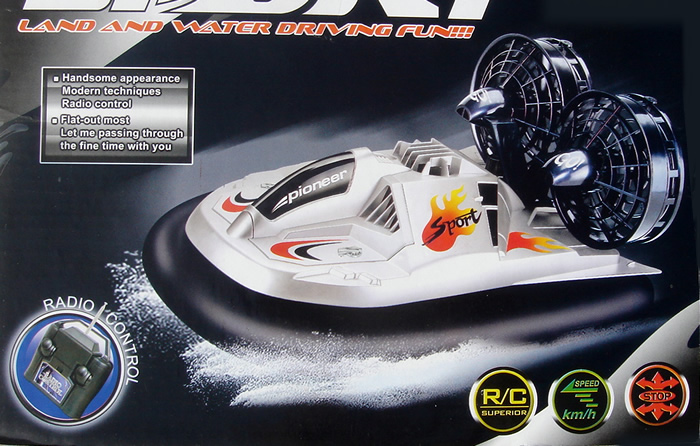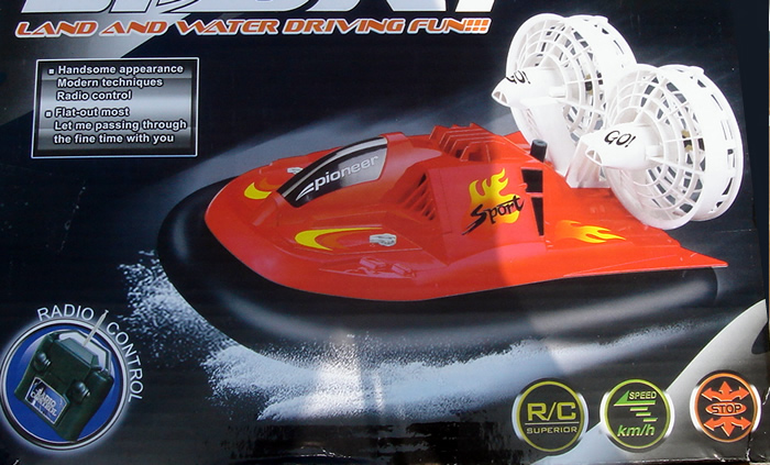 propulsion and steering. Hovercraft blasts over most any level surface flat