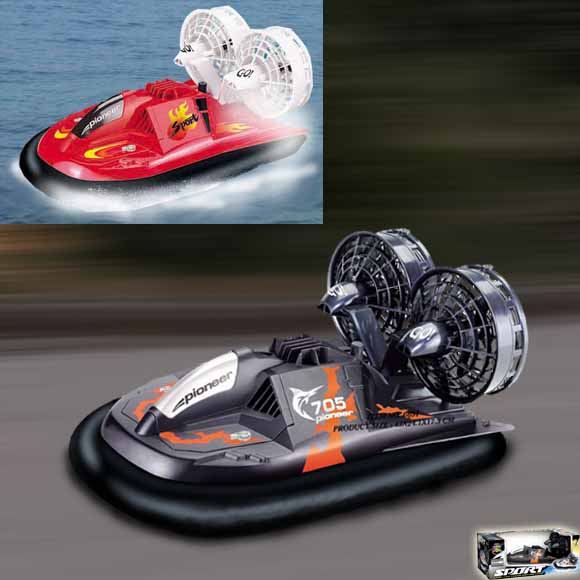 this radio-controlled hovercraft! It jets over surfaces on a cushion of air