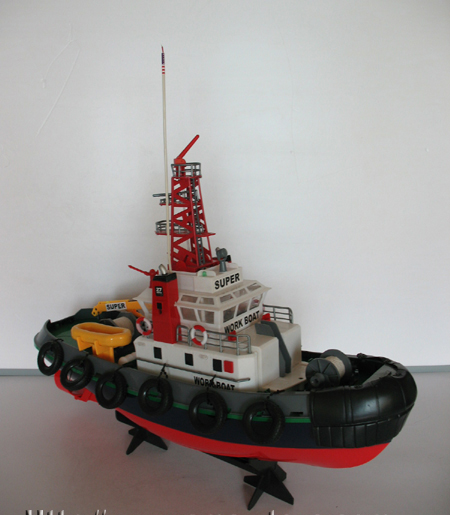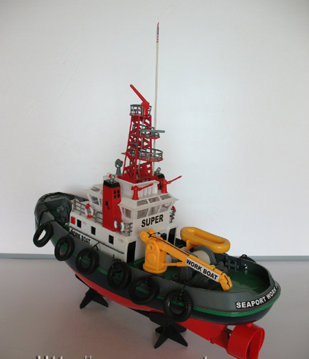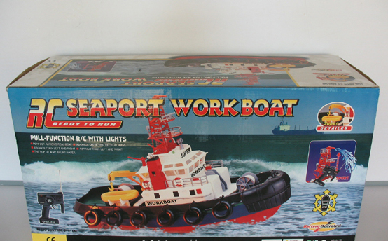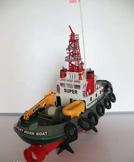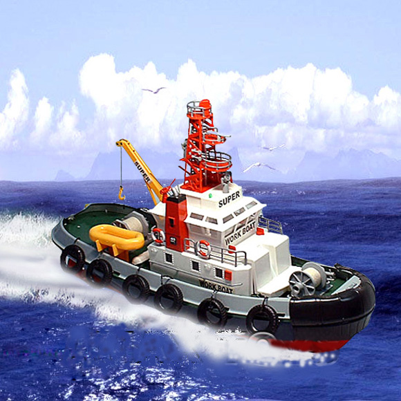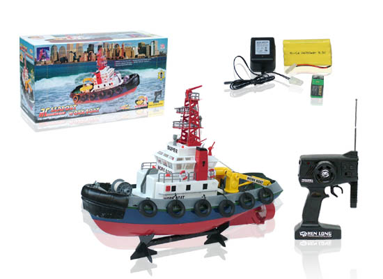 All aboard! Time for some water action with this great RC Tugboat. It is sure you busy all day.This is loads of fun! The tug boat comes with a 3-channel radio control with 7 driving functions -- forward-left-right backward-left-right-stop and also squirt the water using the controller. The tugboat has a working light and a crane for the life boat! This tugboat is very detailed and realistic.